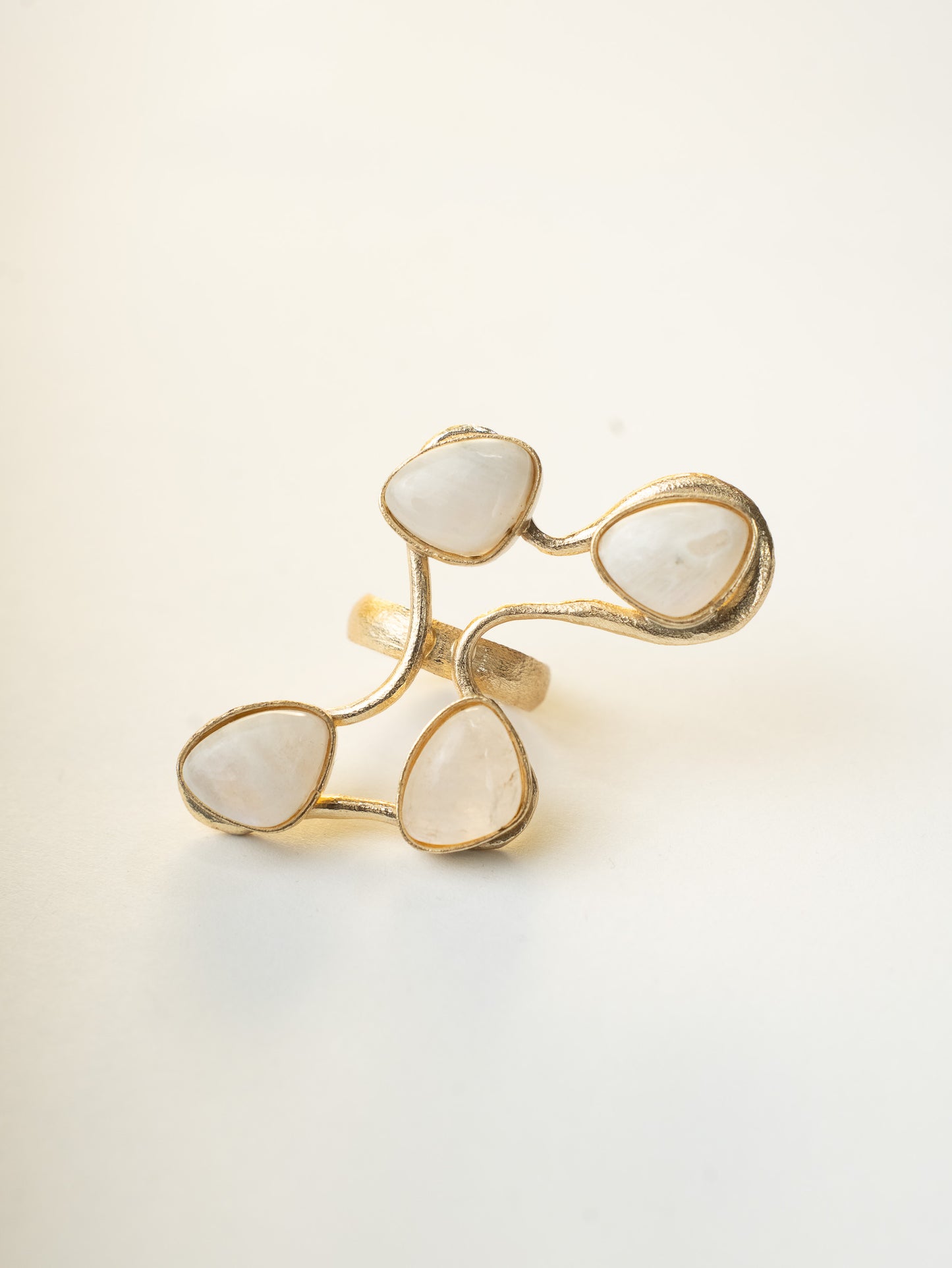 The Soma Ring holds four glowing moonstones across a richly textured adjustable band. It wraps to fit you comfortably, but still has presence. You see it. You feel it.