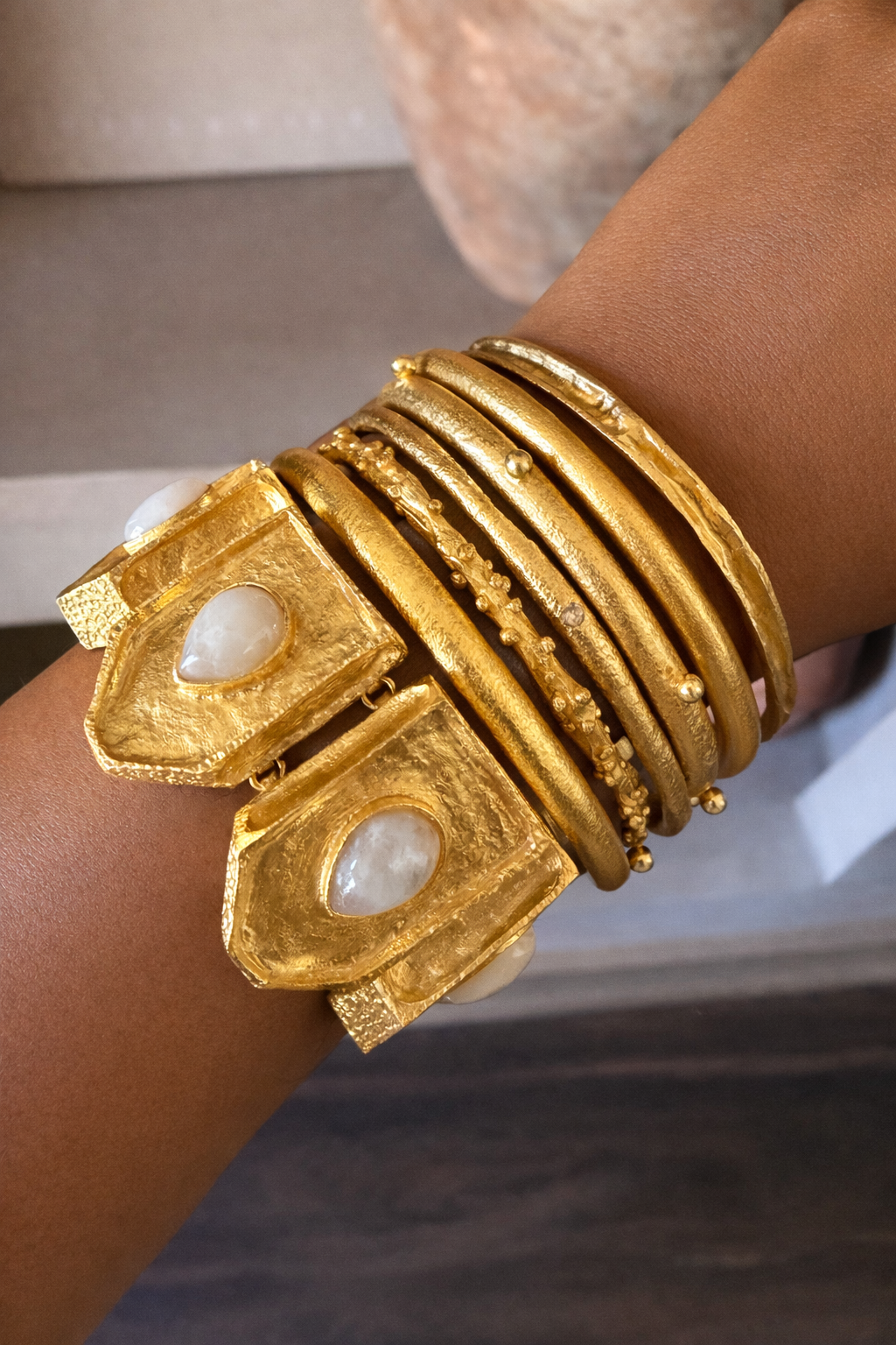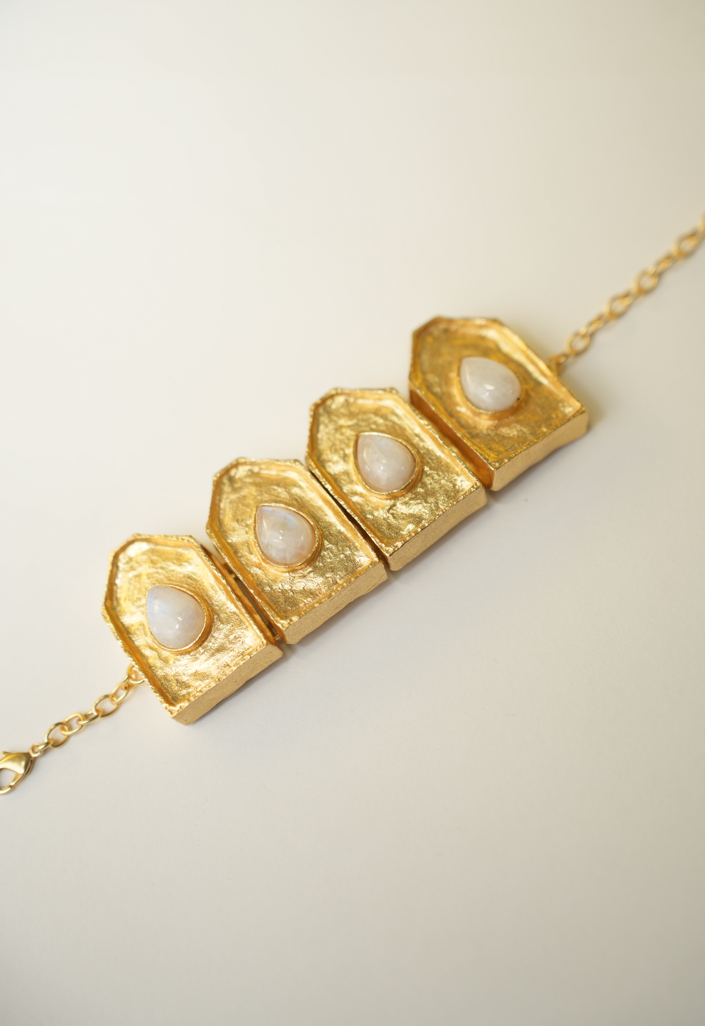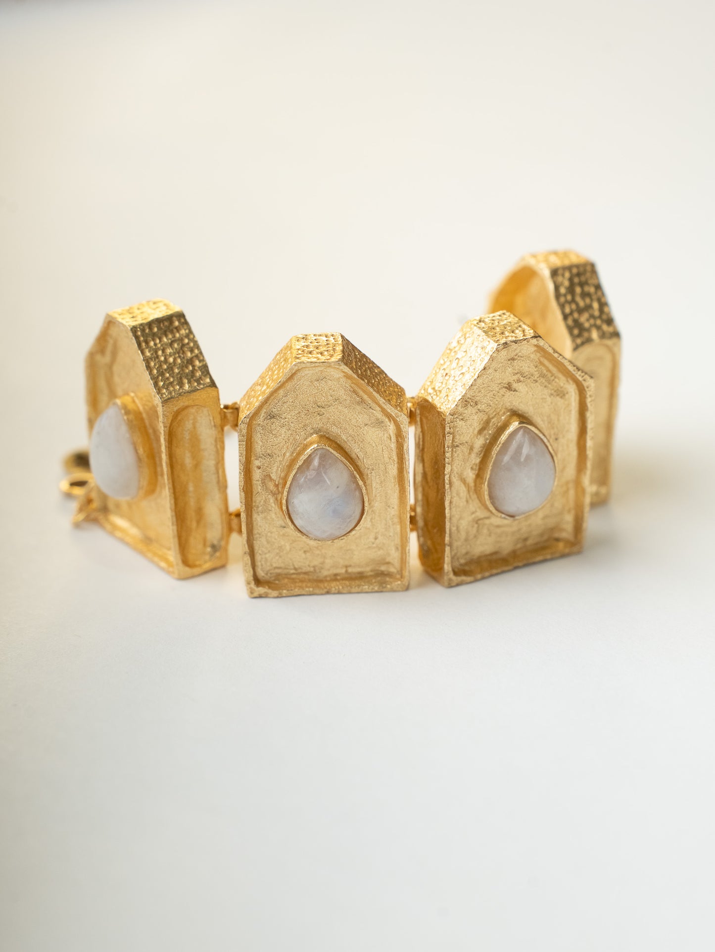 Handcrafted in India for the Aurora : Origin chapter, this adjustable gold bracelet blends textured, brutalist structure with soft, glowing pear-shaped moonstones. Architectural panels. Raw, hand-hammered finish. Strong lines. Feminine energy. It’s that vintage-meets-modern balance we love, collectible, intentional, and made to build on.